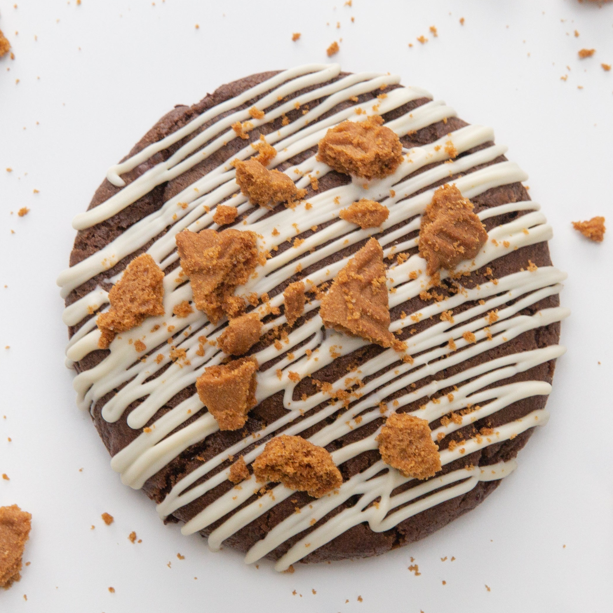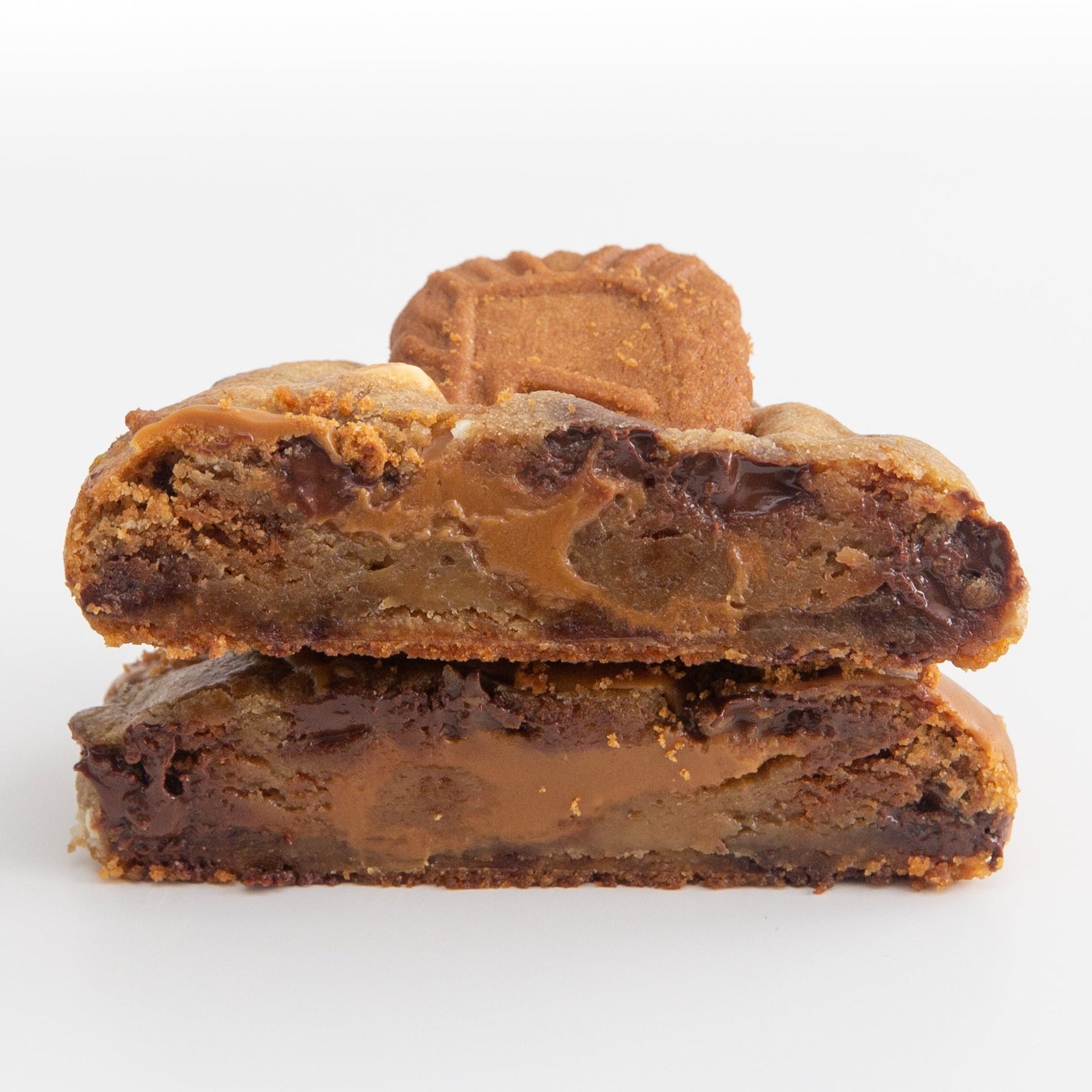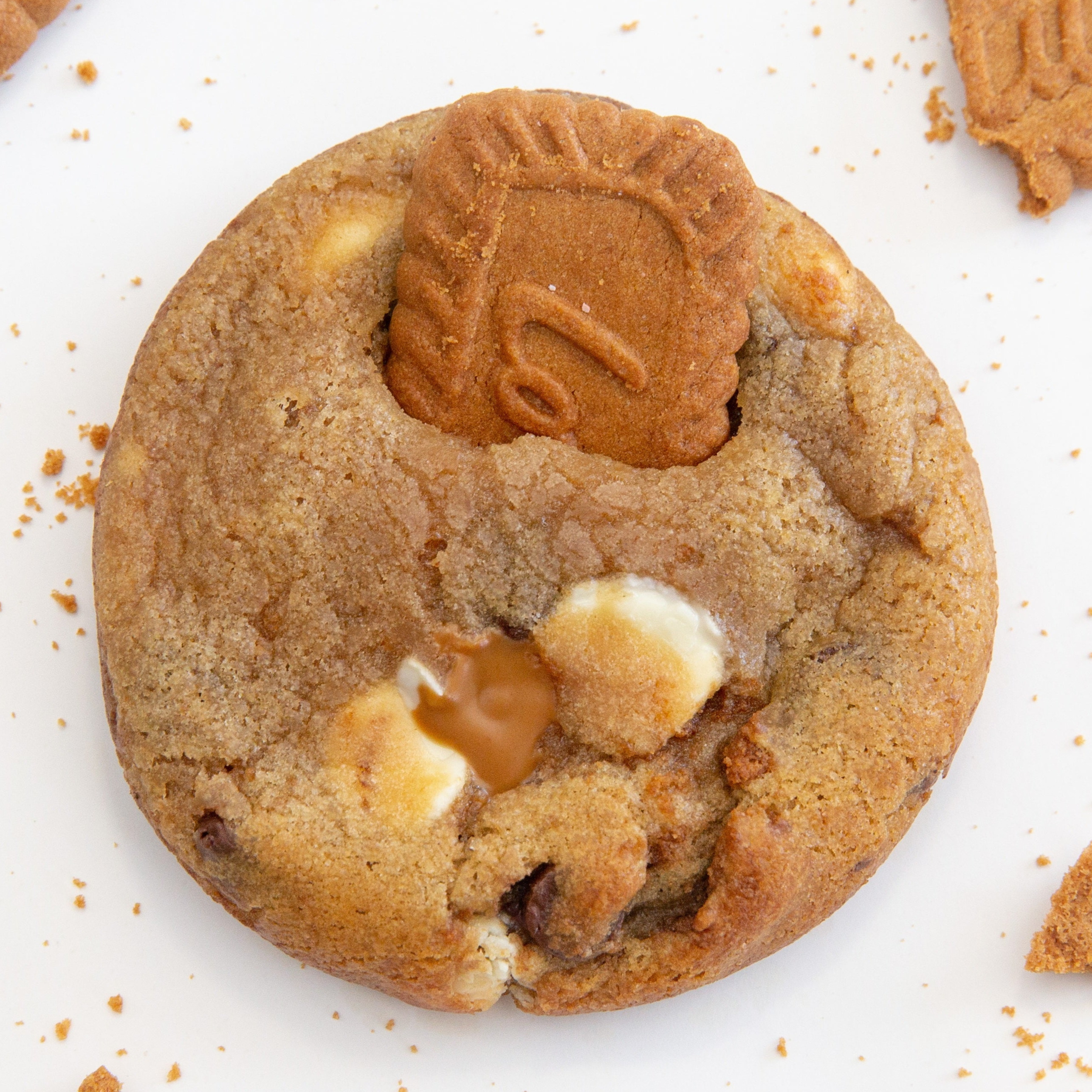 A soft cookie with white and semisweet chocolate, crunchy Biscoff cookies, a gooey Biscoff spread filling, and more Biscoff on top.