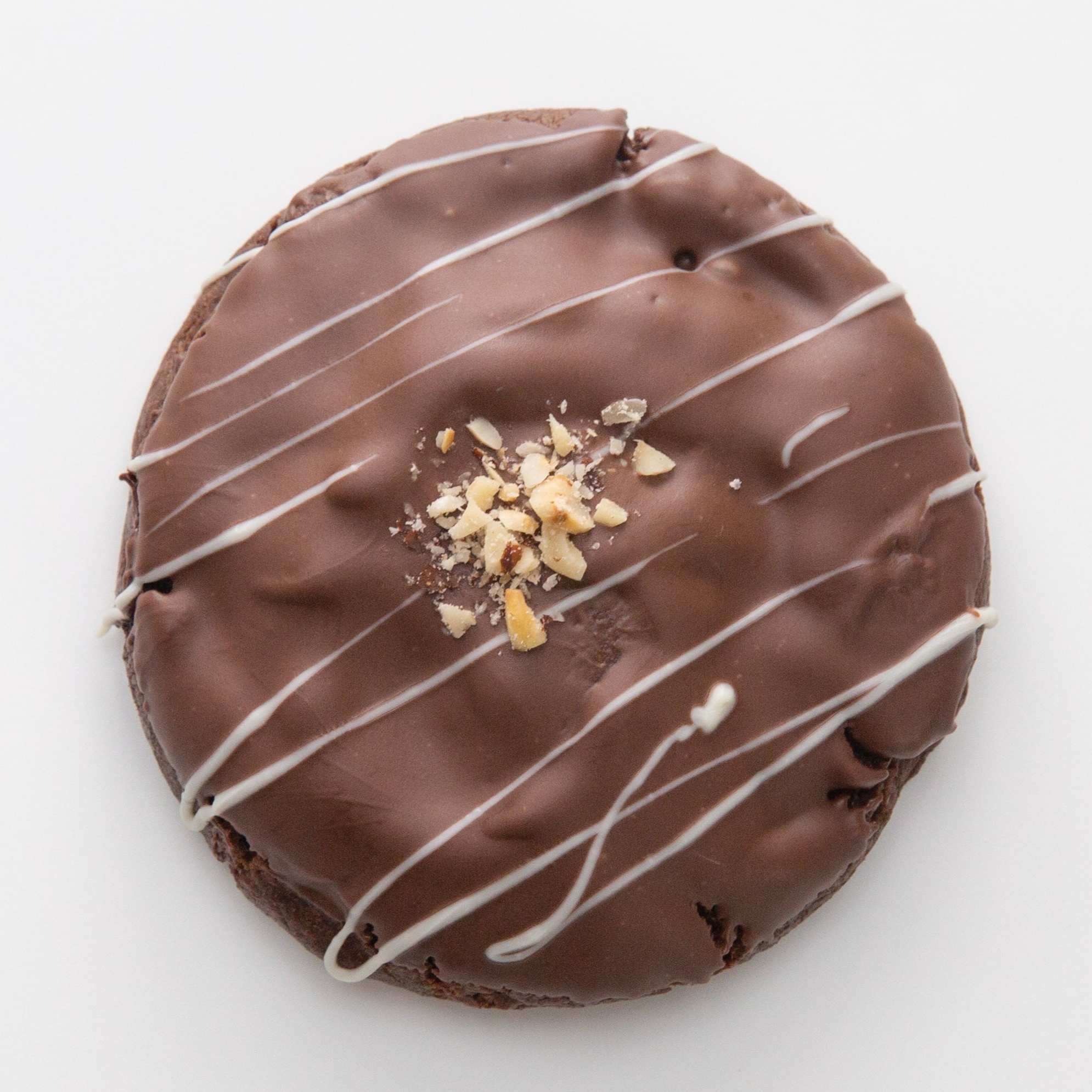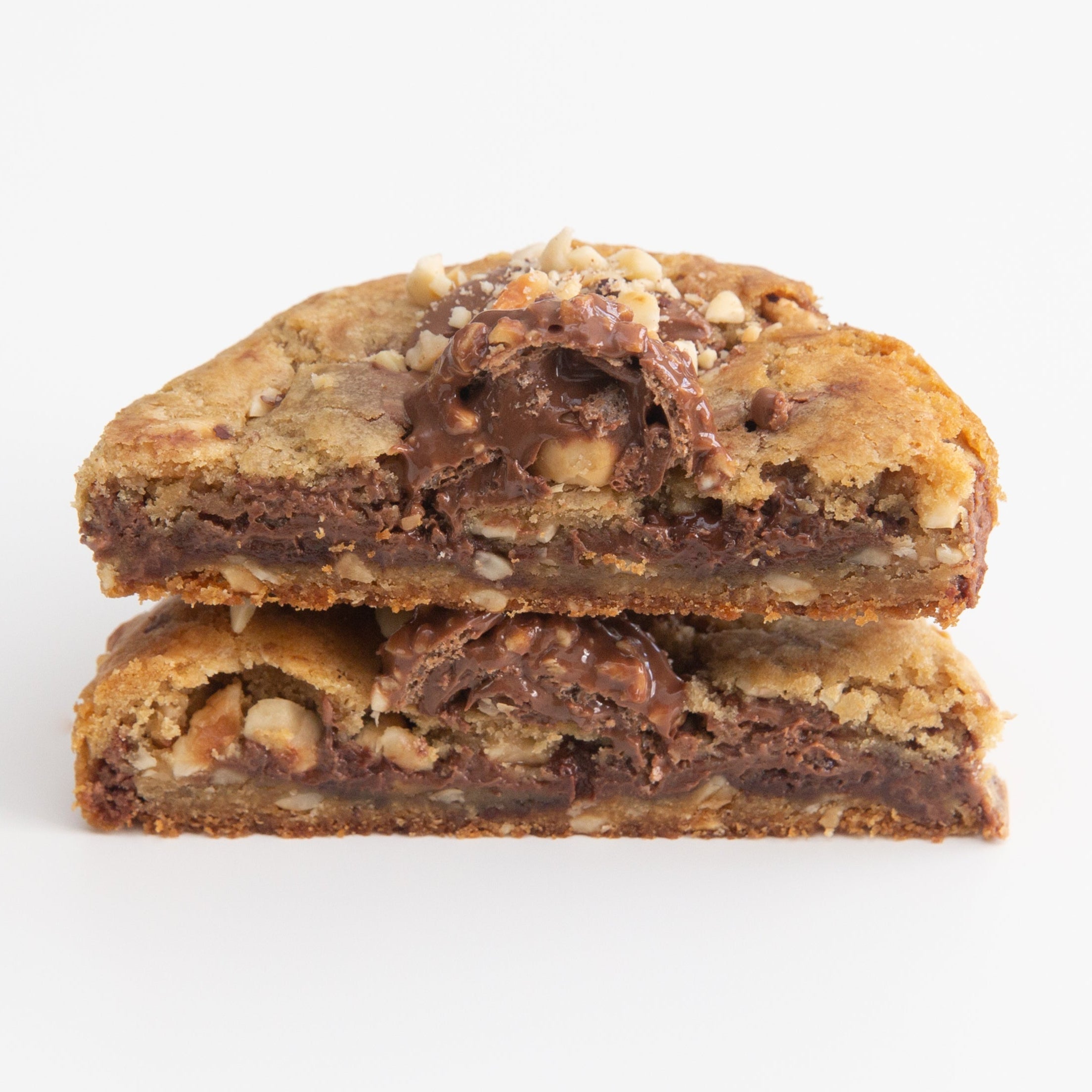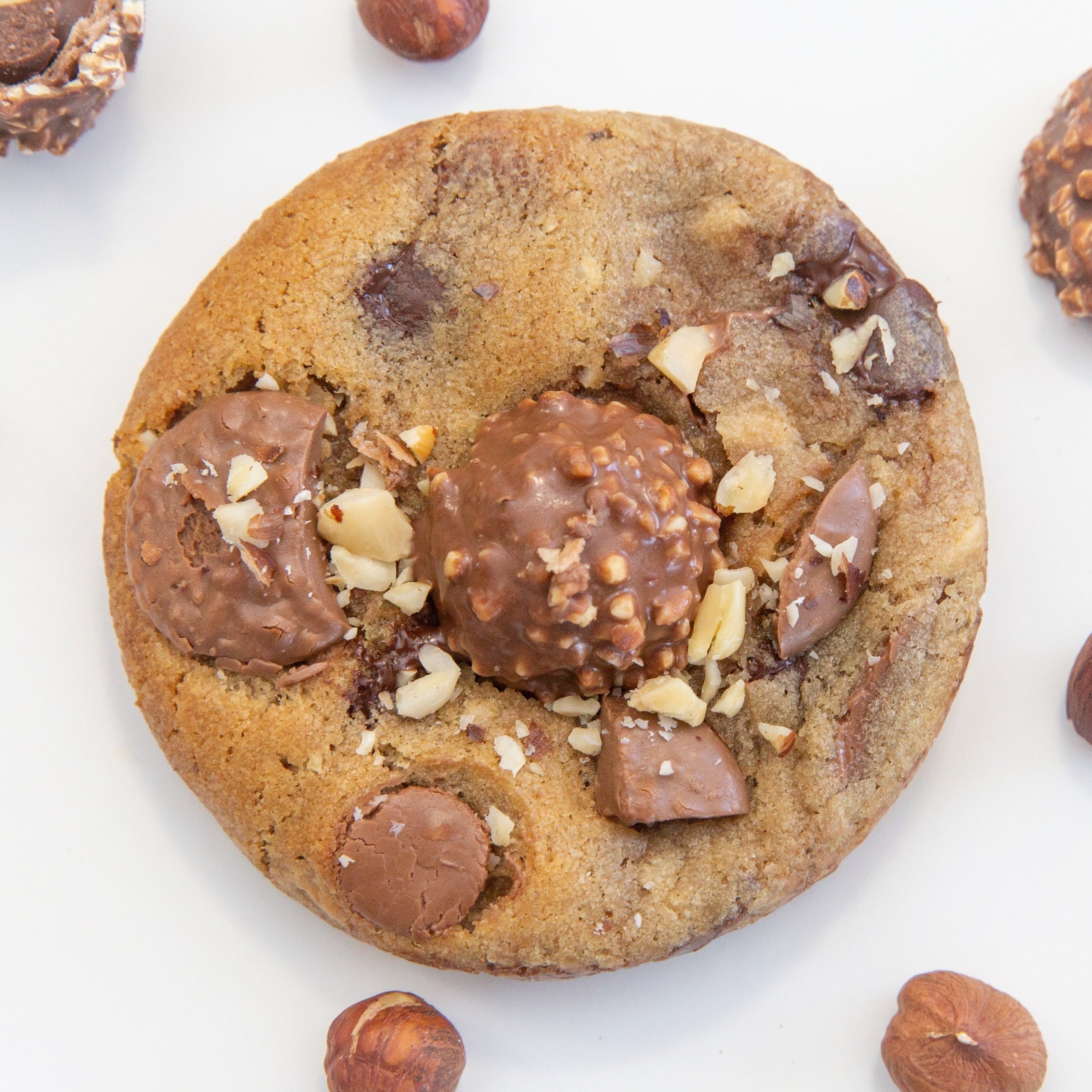 A crunchy hazelnut cookie with milk and semisweet chocolate, filled with gooey Nutella and topped with a Ferrero Rocher and more hazelnuts.