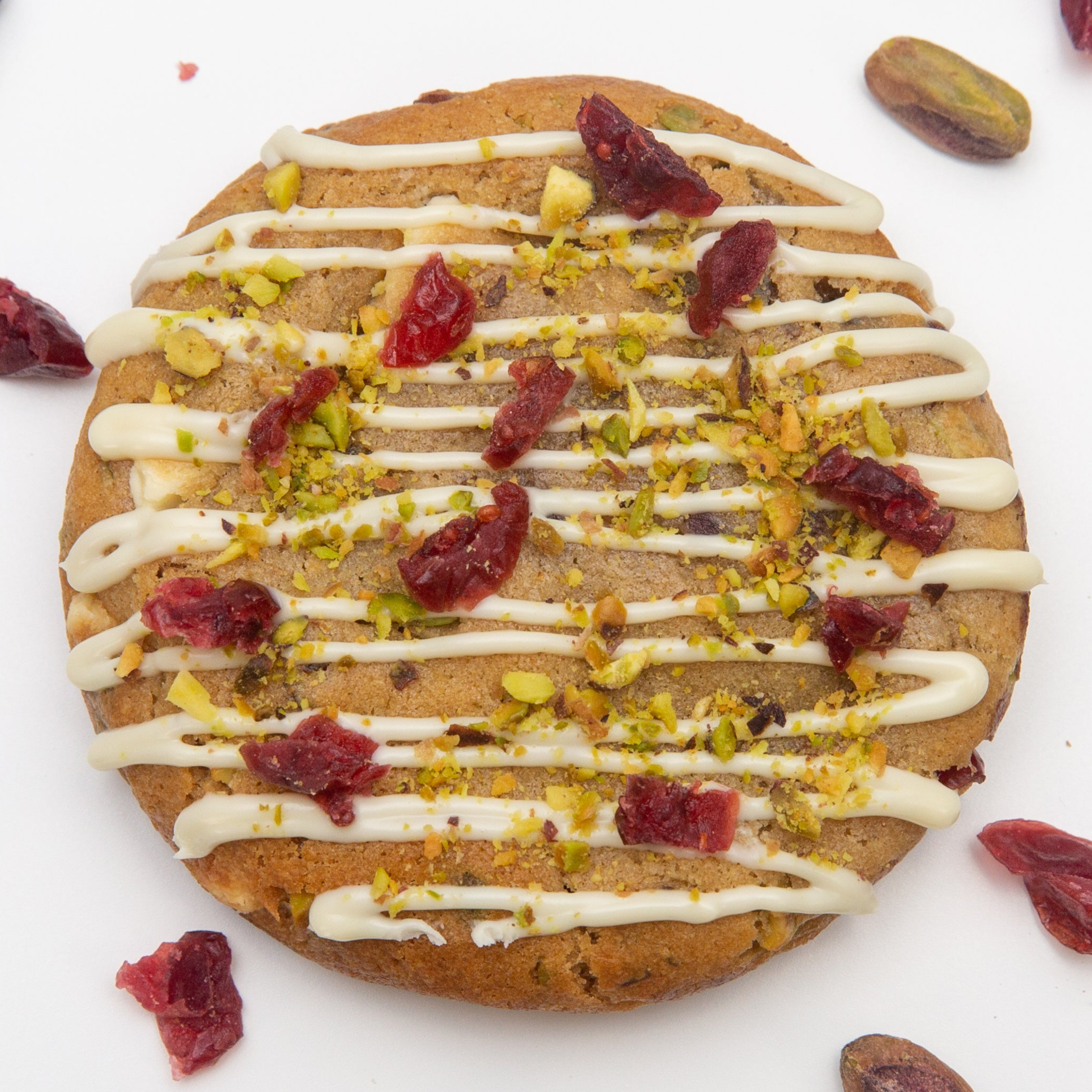 A delicious blend of pistachios, cranberries and white chocolate, with a pistachio ganache filling and topped with more white chocolate, pistachios and cranberries!