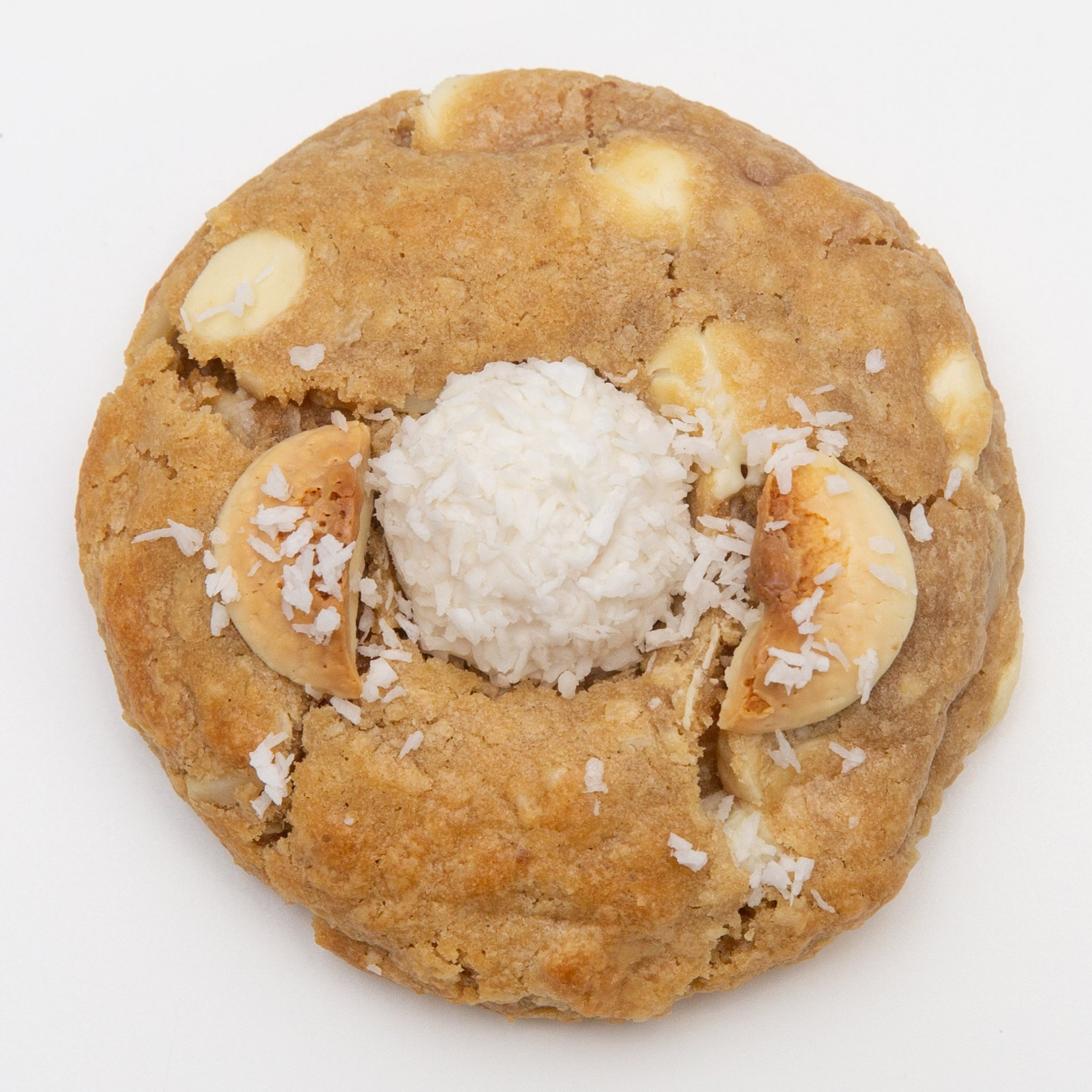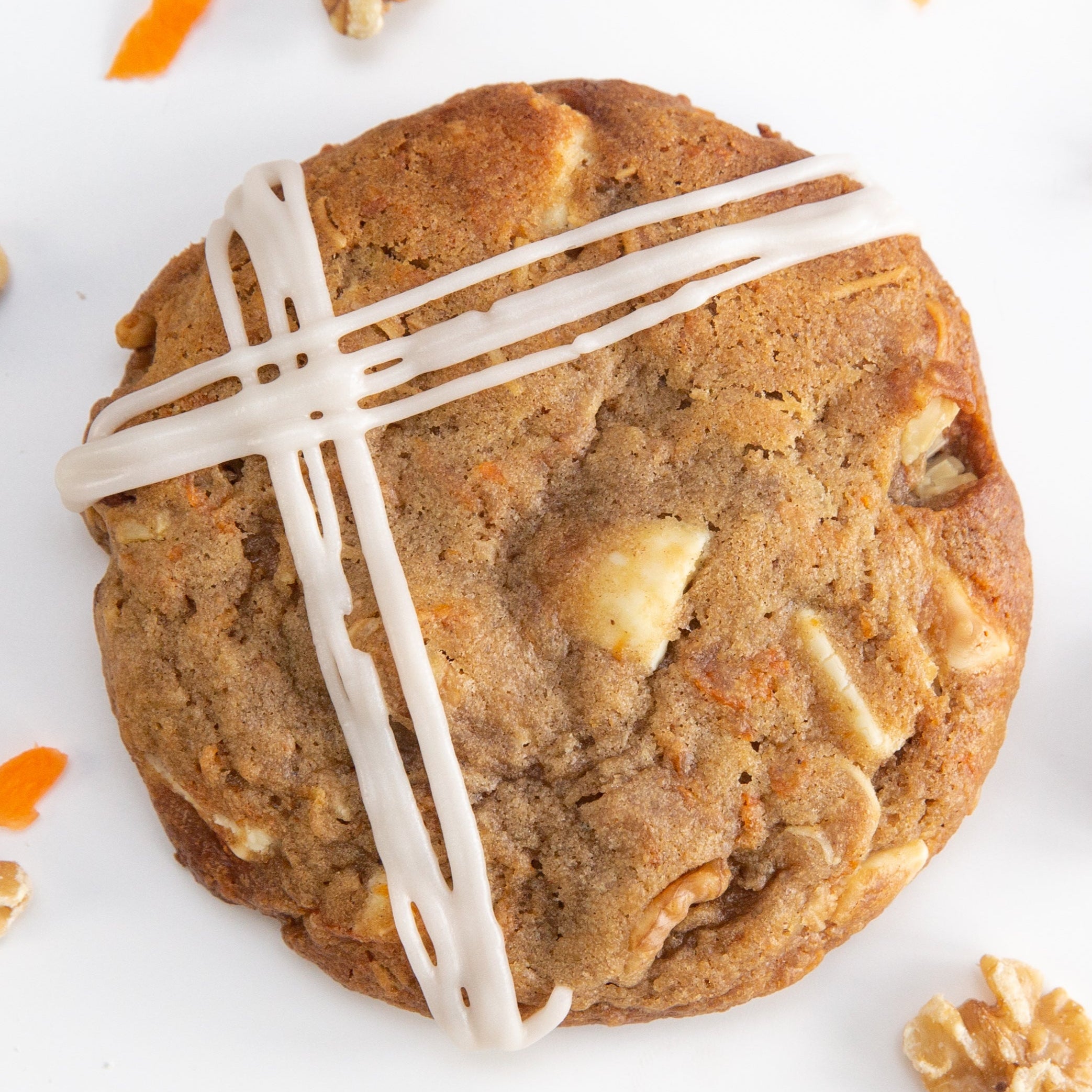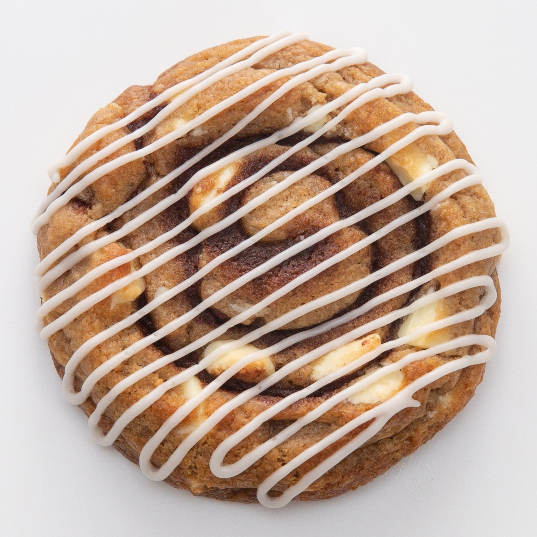A warm, comforting treat with cinnamon-spiced dough, swirls of cinnamon brown sugar butter and creamy white chocolate. Topped with a vanilla glaze, it’s like biting into a soft, gooey cinnamon roll in cookie form.