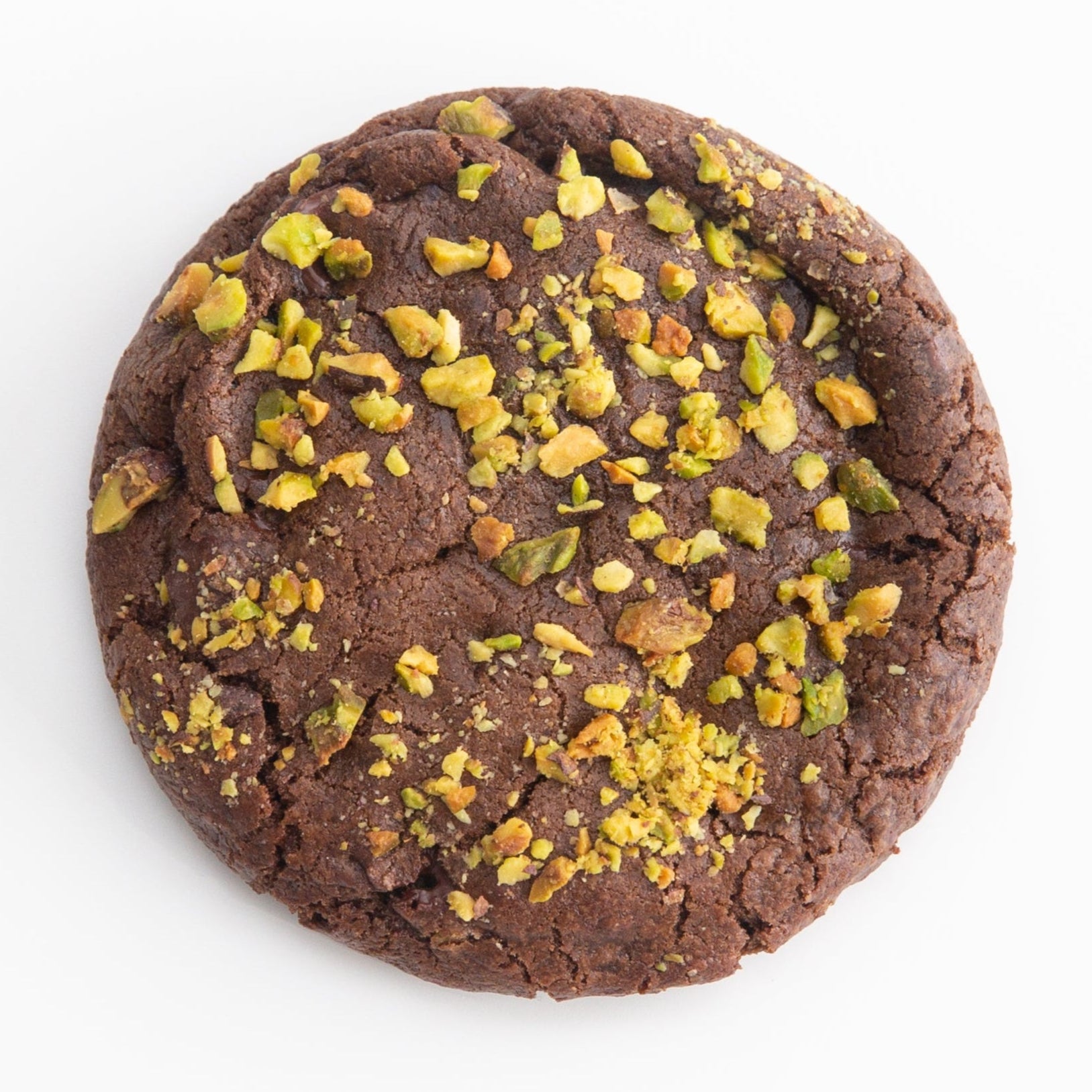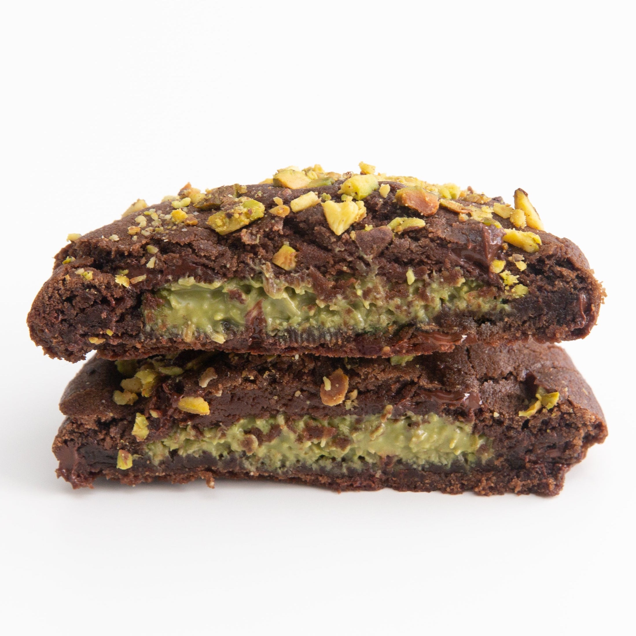 Inspired by the viral Dubai chocolate, cocoa based dough with semisweet chocolate filled with pistachio cream and crispy knafeh, topped with more pistachios.