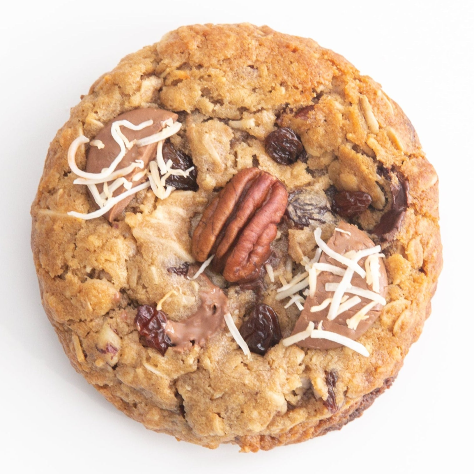 A hearty, flavor-packed cookie loaded with rolled oats, raisins, toasted coconut and crunchy pecans. This classic treat is elevated with a rich combination of milk and semisweet chocolate, creating the perfect balance of chewiness and crunch in every bite!