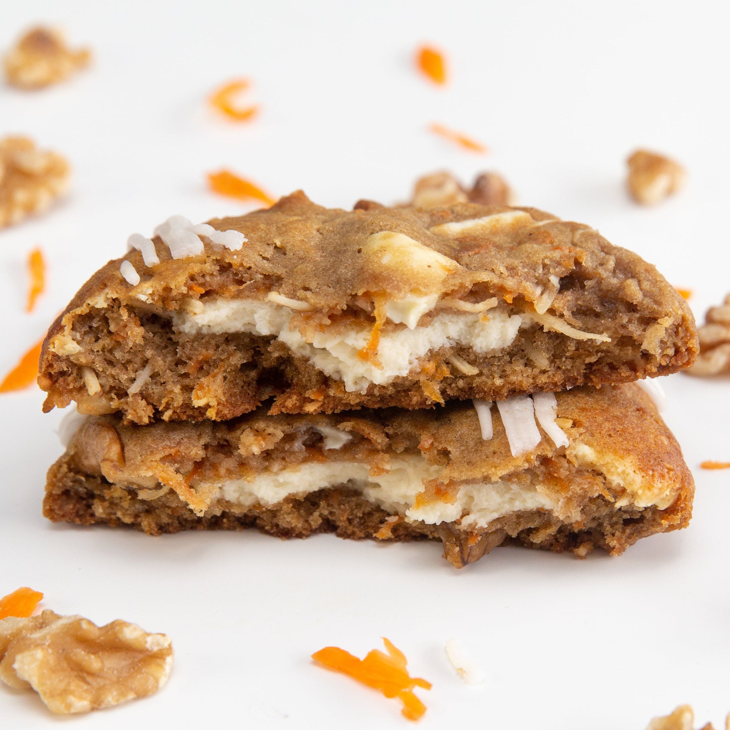 Spiced dough with cinnamon, ginger, and nutmeg, loaded with carrots, walnuts, white chocolate and coconut, stuffed with cheesecake filling