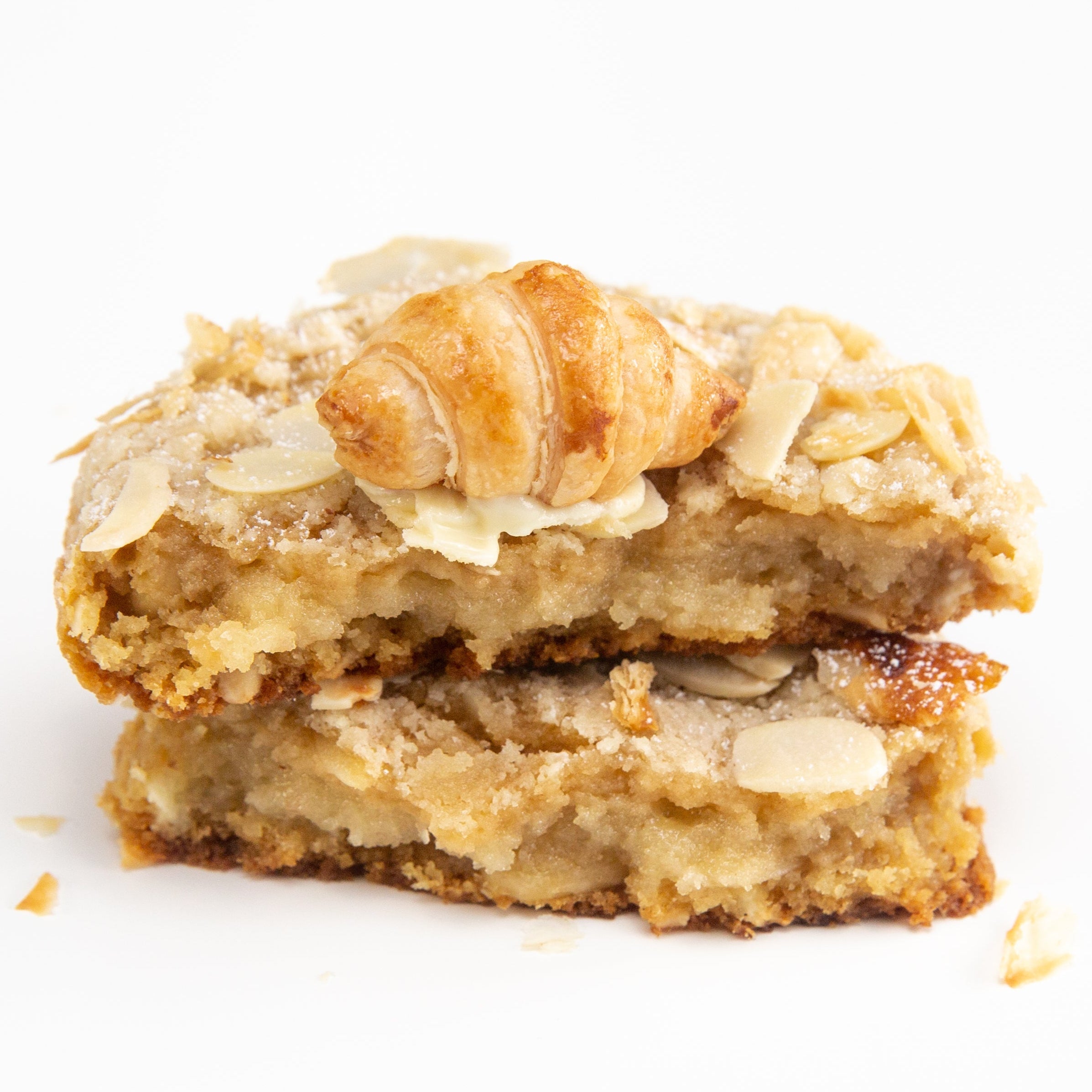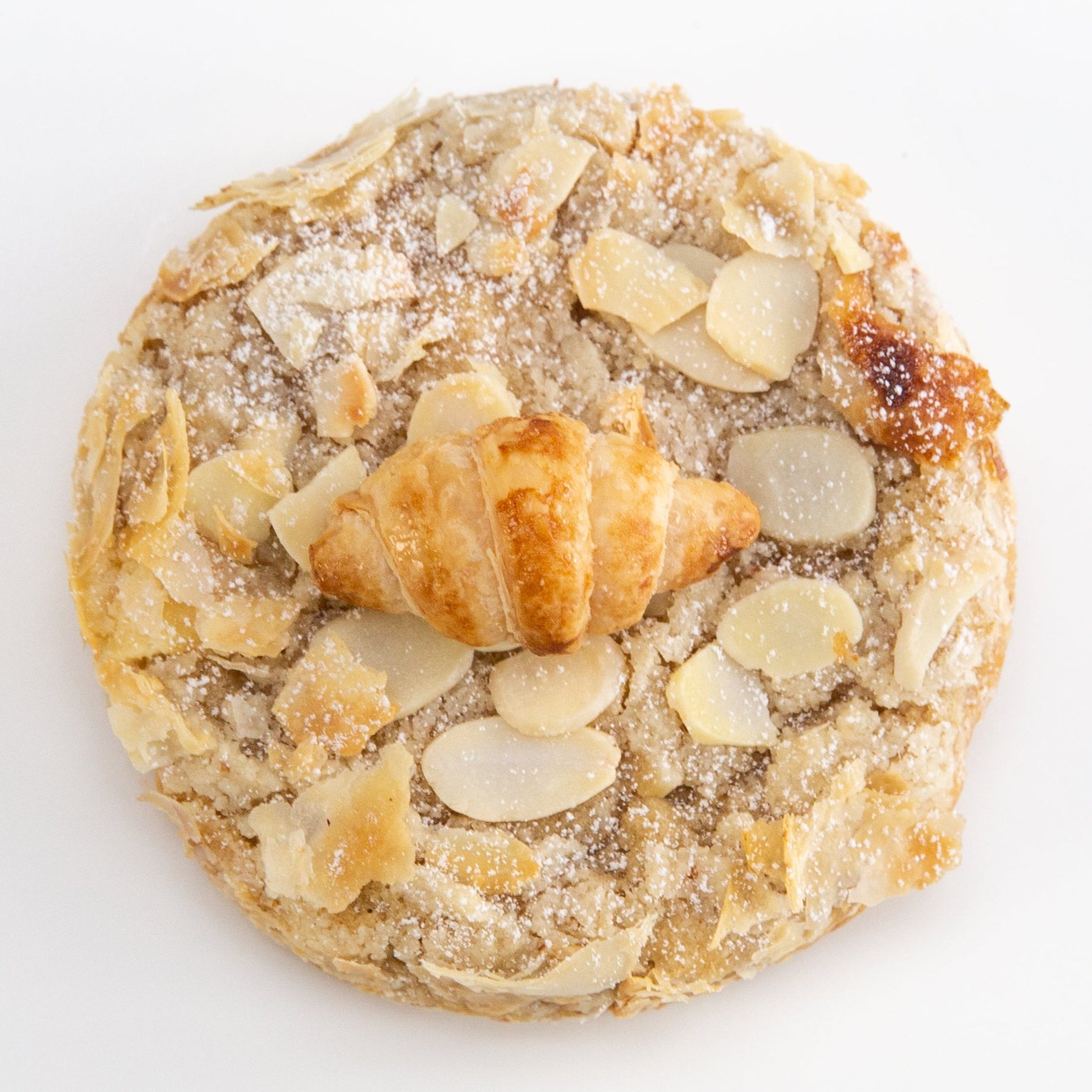 Buttery dough with almonds and white chocolate, filled with rich almond cream (frangipane), topped with pastry pieces, flaked almonds and a cute mini croissant!