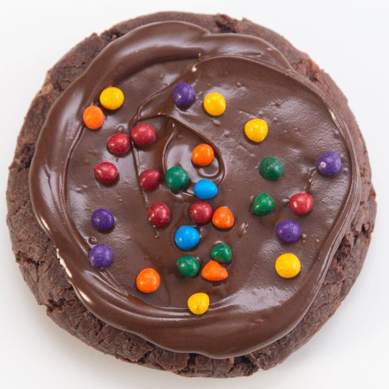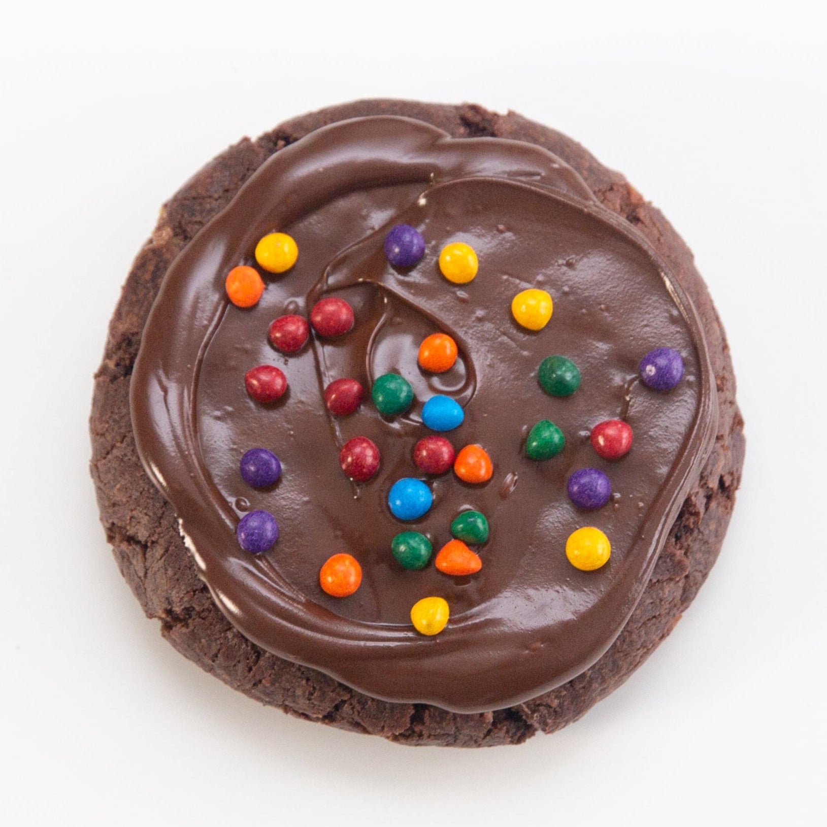 A rich dark cocoa cookie loaded with Belgian milk chocolate, topped with silky chocolate ganache and a sprinkle of colorful candy-coated chocolate chips just like the nostalgic treat, but in cookie form.