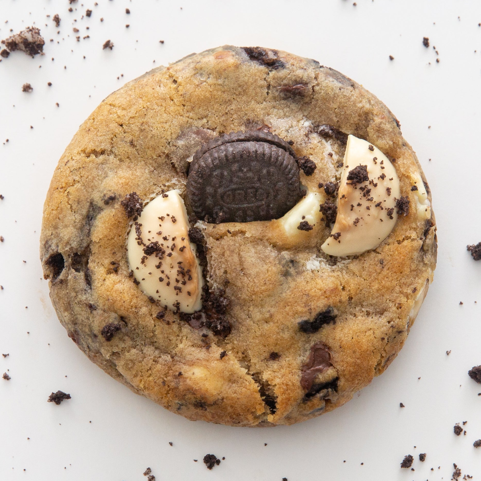 A rich cookie with white and semisweet chocolate, loaded with crushed Oreos and topped with a mini Oreo.
