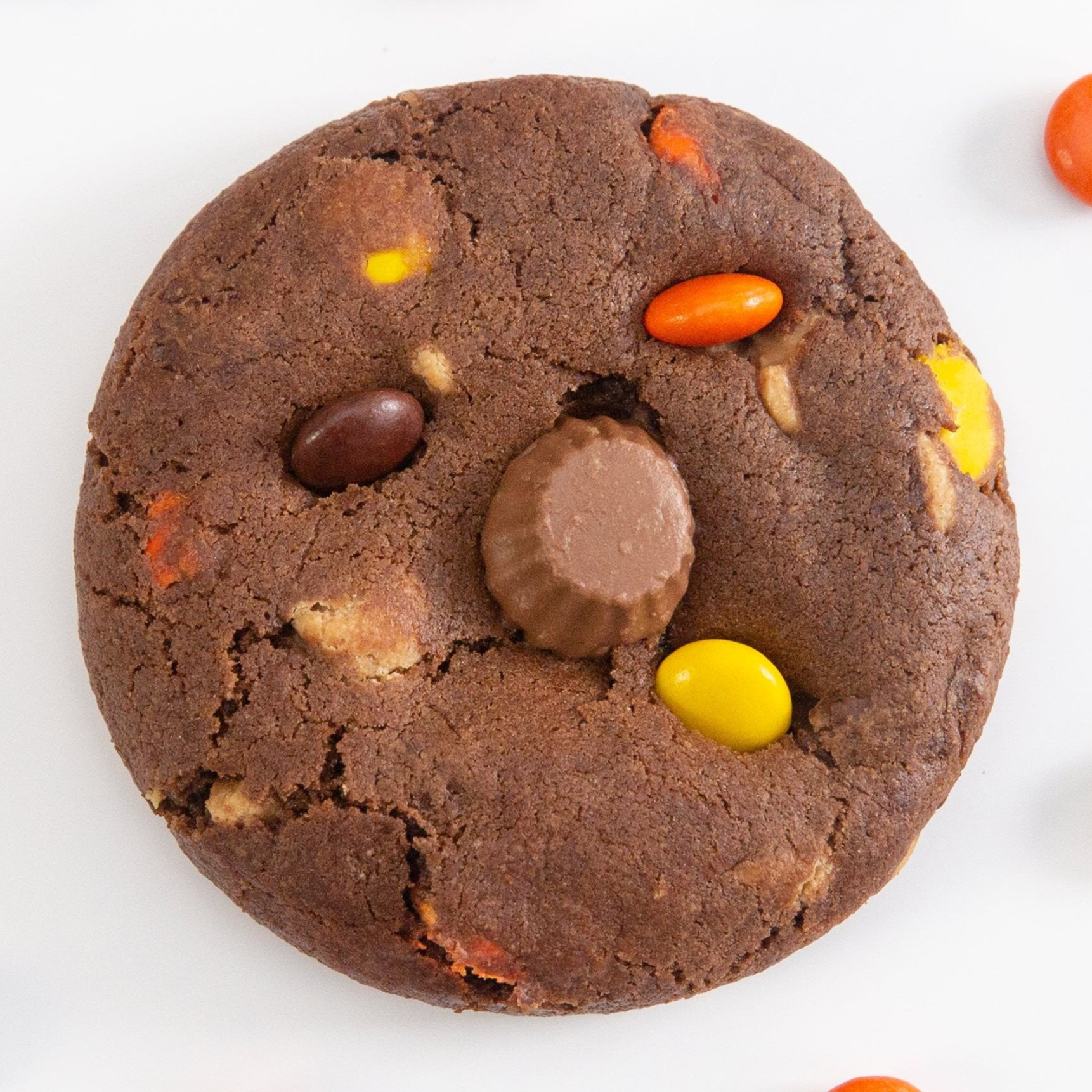 A chocolate and peanut butter lover’s dream! This cocoa-based cookie is loaded with semisweet chocolate, creamy peanut butter chips, Reese’s Pieces and mini peanut butter cups!