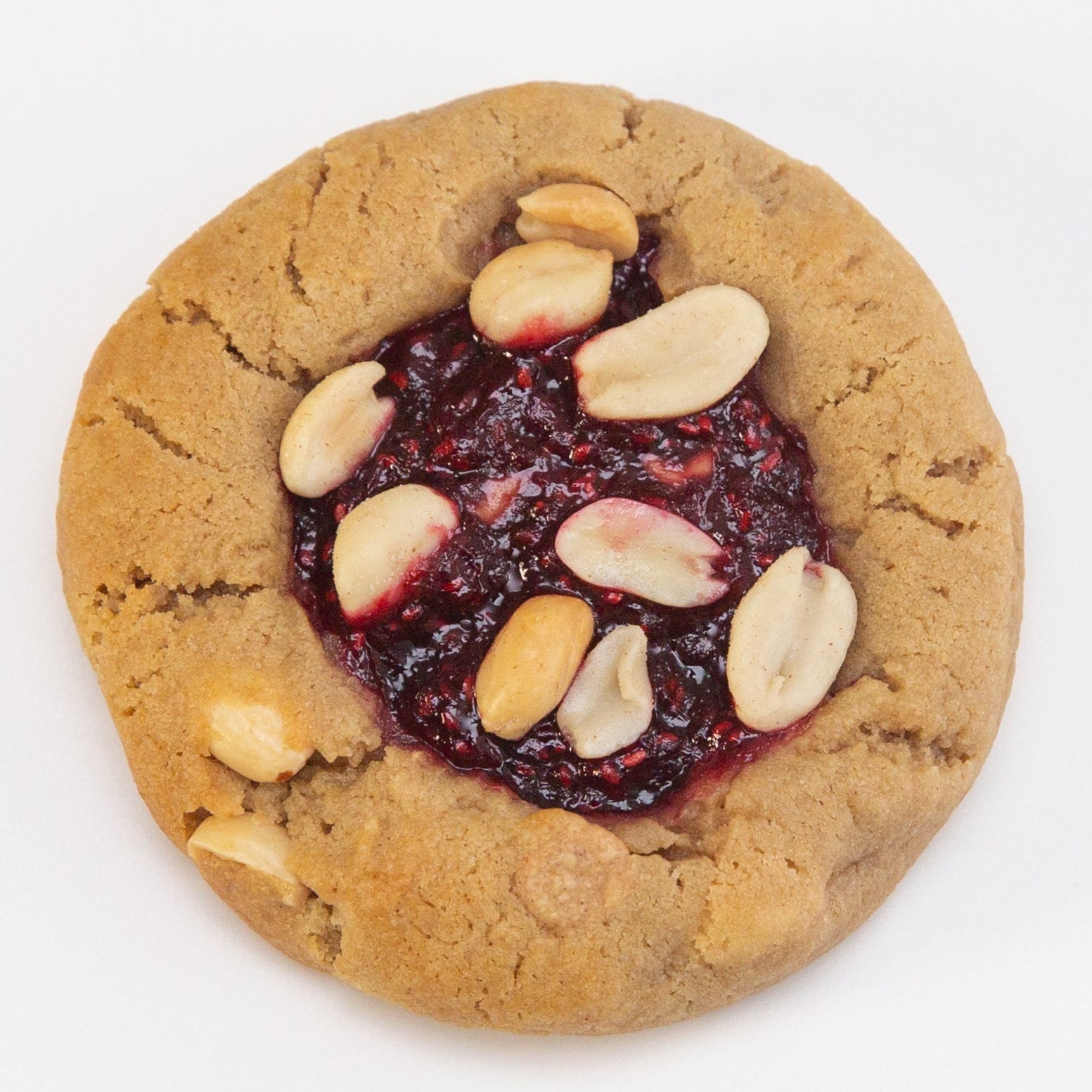 A soft peanut butter cookie packed with peanut butter chips and crunchy peanuts, filled with our house-made raspberry jam for the perfect PB & J bite.